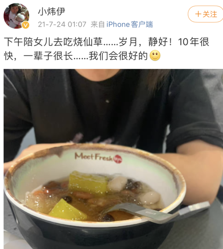 2021年7月24日,叔叔项余遇带着小伊伊去吃烧仙草,他在微博上亲切的叫小伊伊为“女儿”。